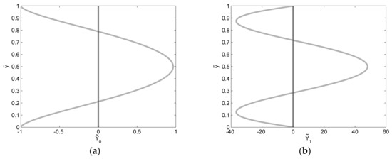 Both and are obtained as the product of a function of and ( or ) and a function of ( or ). Where or is positive, the sign of or as a function of coincides with the sign of or . Where or is negative, the sign of or as a function of is opposite of or ’s. Thus, for example, where is negative (and that happens for , that is, in the raising branch of the section-average Gaussian bell), we have < 0 in the central part of the cross-section and > 0 near the side boundaries. That means that, at order δ0, while in the central part of the cross section total concentration is lower than the average, at the side boundaries it is higher. Vice versa for positive . That means that, while at the back of the section-average Gaussian wave (7) solute mass is concentrated at the boundaries (the slower part of flow field), at the front of the section-average Gaussian wave (7) solute mass is concentrated at the center (the faster part of flow field). Specifically, along the transverse direction, exhibits two (positive) maxima at the banks and a (negative) minimum at the channel axis for , where ; it is > 0 for and < 0 for . Conversely, exhibits two (negative) minima at the banks and a (positive) maximum at the channel axis for , where ; it is > 0 for and < 0 for and (see Figure 1a combined with Figure 2a). Unlike the leading order component, the first-order diffusive contribution is characterized by four zeros (). Thus, depending on the local sign of function (> 0 for and < 0 for ), it has its maximum at the centre of the cross-section or within more peripheral layers, for and (see Figure 1b combined with Figure 2b). This asymmetry would justify an anomalous delay in the breakthrough curves between first particle arrivals and last particle arrivals. It should also be noted that, whereas , viewed as a function of time, tends to a constant proportional to PeM, tends to increase linearly. In term of the deviatory first order concentration solution (according to Equation (17)), this continuous increase is partially balanced by the small value of (see Figure 3).