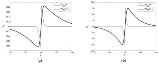 where “Ei” indicates Exponential-Integral Function (e.g., [35]). See Figure 1, Figure 2, Figure 3, Figure 4, Figure 5 and Figure 6 for a graphical illustration of the solution with reference to two different macro-Peclet numbers (1 and 0.01, respectively) assuming . Specifically, Figure 1a,b display and , respectively; Figure 2a,b display and , respectively, as a function of ; finally, Figure 3a,b display and , respectively, as a function of . Note that Equations (31) and (34) consistently give zero at the section-averaged concentration maximum and at the section-averaged concentration tails (). Additionally, they would reproduce the typical two-peaked longitudinal structure detected in previous studies on concentration variance in heterogeneous velocity fields (e.g., [7,36,37,38]). Indeed, since concentration spatial variance in constant-width stream flows by definition is, Equation (37):