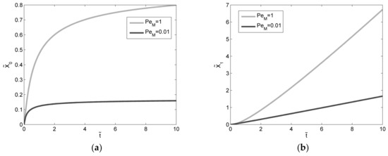 (a) Function for two different macro-Peclet numbers at (b) Function for two different macro-Peclet numbers at .