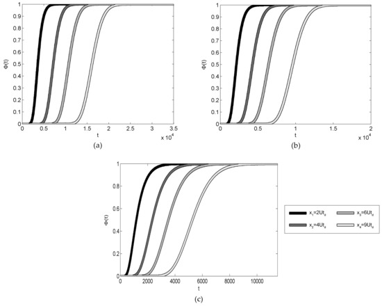 It is well known that the breakthrough curves are a measure of the percentage solute mass that has crossed a given section at a given time and allow us to establish whether, and to what extent, concentration distribution is affected by tails and decelerations. As a matter of fact, their use by-passes the evaluation of the actual , which is analytically accessible only in approximate forms (an example was shown above) and is numerically affected by unavoidable errors due to discretization issues and virtual diffusion. Following the mentioned Lagrangian approach, we evaluated the cumulate of concentration by counting the percentage number of particles that, at the generic time t, were characterized by Figure 4a, Figure 5a and Figure 6a show the breakthrough curves for the three cases under investigation in conditions of uniform turbulent mixing; Figure 4b, Figure 5b and Figure 6b do the same in the presence of non-uniform mixing (for R1, R2 and R3, respectively). The time on the abscissa corresponds in every case to 2 average diffusive times. Finally, for the sake of comparison, Figure 7a–c display the theoretical cumulative distributions corresponding to the one-dimensional Gaussian in the presence of uniform mixing, Equation (48):