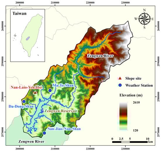 Located at the boundary between Tainan City and Chiayi County, the Zengwen reservoir catchment area belongs to the upper and middle reaches of the Zengwen watershed in Taiwan. The area of catchment and the reservoir are 481 km2 and 7.1 km2, respectively, which make this Taiwan’s largest reservoir (Figure 1). The Zengwen reservoir catchment area is located in the Western Foothills geological area. The strata in this region are mainly from the Miocene epoch of the Tertiary Period to the Pleistocene epoch of the Quaternary Period and consist mostly of gray fine sandstone and shale. Due to the high mud content in the formation, and the relatively young geological age and poor consolidation, it is easily affected by weathering. As a result, the river terrace on both sides of the stream is well developed and there are many rainfall-triggered collapses that have occurred in this area. The terrain in this region decreases in altitude from the northeast to the southwest, with elevations ranging from 100 m to 2600 m. The geographical location of the Nan-Laio-Yeh-Hsi slope is between the Da-Dong-Shan and Ma-To-Shan rainfall stations. The overburden of the slope is composed of sand, and the bedrock is sandstone.