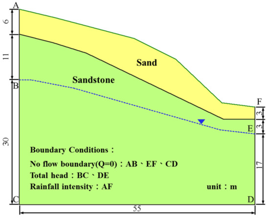This study used the profile of the Nan-Laio-Yeh-Hsi slope in the Zengwen reservoir catchment area [30] for construction of the slope model (Figure 2). The boundary of the slope surface (A–F boundary) was set as the rainfall infiltration boundary, and the sides of the slope (B–C and D–E boundaries) were set as the boundaries of the fixed water level to maintain the depth of the original groundwater level in the slope. A–B, C–D, and E–F are the boundaries of zero-flow; the inflows and outflows at these three boundaries control seepage not occurring underground. The Nan-Laio-Yeh-Hsi slope consists of jointed sandstone with an overburden of a 3 to 9 m thick layer of sand (Figure 2). Sand can have very different properties in nature. With regard to the present study, grain structure, density, hydraulic conductivity, and shear strength are of particular importance. For practical reasons, these parameters were determined by means of tests in situ or on undisturbed soil samples.
