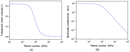 where is the residual water content (-); is the saturated water content (-); is the negative pore water pressure (ML−1 T−2); a, n, and m are fitting parameters including the soil air-entry value, the gradient of the soil water retention curve, and the gradient of the curve at which time the soil enters the residual water content state, respectively; and is the saturated hydraulic conductivity coefficient (L T−1). From this equation, we can obtain the corresponding pore water pressure and soil water permeability of sand under different water content conditions (Figure 3).