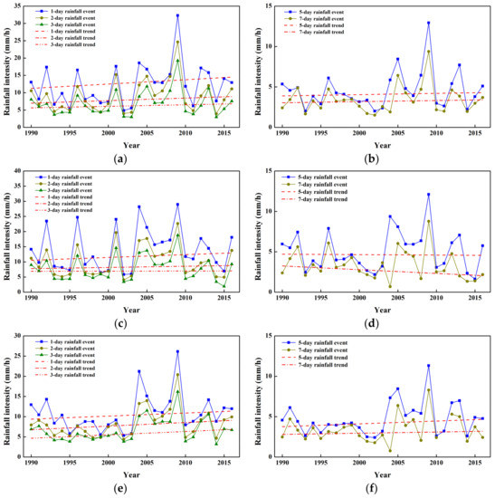 Rainfall intensity variation patterns from 1990 to 2016: (a) 1, 2 and 3 day rainfall events at Da-Dong-Shan rainfall station; (b) 5 and 7 day rainfall events at Da-Dong-Shan rainfall station; (c) 1, 2 and 3 day rainfall events at Ma-To-Shan weather station; (d) 5 and 7 day rainfall events at Ma-To-Shan rainfall station; (e) 1, 2 and 3 day rainfall events at San-Jiao-Nan-Shan rainfall station; (f) 5 and 7 day rainfall events at San-Jiao-Nan-Shan rainfall station.