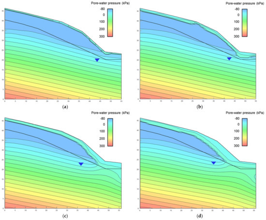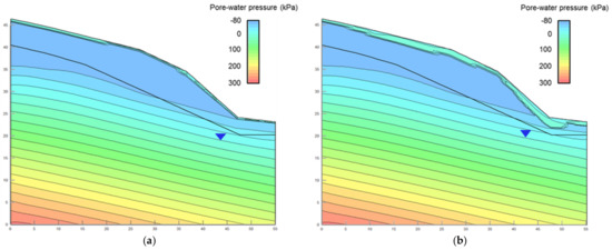 This study used the SEEP/W module of the GeoStudio (Company of GEO-SLOPE, Calgary, AB, Canada) [31] numerical analysis software to conduct two-dimensional transient seepage analysis of slopes with homogenous soil to analyze the effects of rainfall intensity changes in 2016, 2050, and 2100 on the hydrological status of the slope. By using the maximum one-day rainfall intensity of the Da-Dong-Shan rainfall station in 2016, 2050, and 2100 as an example, this study simulated the average rainfall for a continuous period of 24 h. Figure 5 shows the distribution status of pore-water pressure in the slope soil after 6, 12, 18, and 24 h of continuous rainfall in 2016. Figure 5a indicates that after 6 h of rainfall, the surface soil of the slope was affected by rainfall, and the soil water content approached saturation. Therefore, the soil pore-water pressure approached 0, forming a 0.5-m-deep transient saturation belt. A comparison of the pore-water pressure distribution status at 12, 18, and 24 h revealed that as the rainfall duration increased, the depth of the soil affected by rainfall, which also experienced changes in pore-water pressure, increased from 0.5 m to an average of 3 m, ultimately causing the phenomenon of elevated groundwater levels. The seepage analysis results of 2016, 2050, and 2100 showed that after 6 h of rainfall, the slope surface soil in 2050 and 2100 was affected by rainfall and that the depth at which the pore-water pressure = 0 was 0.7 m and 1 m, respectively. In addition, the pore-water pressure distribution map at 18 h indicates that the groundwater level increased as a result of rainfall, as shown in Figure 6 and Figure 7. This phenomenon indicates that future increasing trends in rainfall intensity will increase the rainfall infiltration rate and decrease the duration required for slope soil to reach saturation, if the hydraulic conductivity of the soil is higher than the rainfall intensity. The pore-water pressure of saturated soil is 0, which causes the soil to lose shear strength. Therefore, the results indicate that in the future, slopes will be rapidly affected by rainfall and will lose stability.