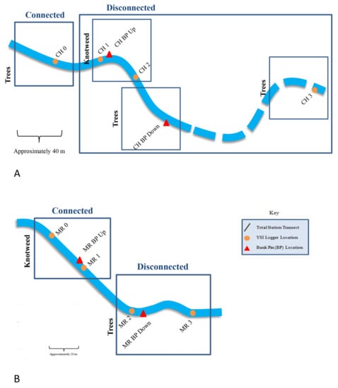 Loggers were installed near the banks. Equipment installed in meanders were placed on the cut bank side. Loggers CH 0 through CH 3 at Chelten Hills were installed in the middle of a connected native trees riparian zone, as well as the beginning and end of a highly disconnected riparian zone with knotweed. There were 80 m between loggers CH 0 and CH 1 and 30 m between loggers CH 1 and CH 2. The distance between the CH 2 and CH 3 was approximately 300 m. CH 3 was placed for a longitudinal study to examine spatial variability. At Mill Run MR 0 and MR 1 were installed at the beginning and end of the connected reach dominated by knotweed and MR 2 and MR 3 were installed at the beginning and end of a disconnected reach with trees. This downstream reach was separated from the upstream reach by both large woody debris and a stormwater inlet channel. There was approximately 30 m between each logger.