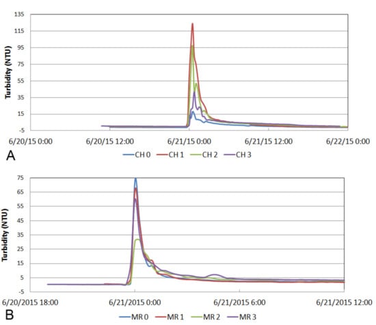 Example turbidity response to storm event. Turbidity response to storm on 21 June 2015 at Chelten Hills (A) and Mill Run (B).