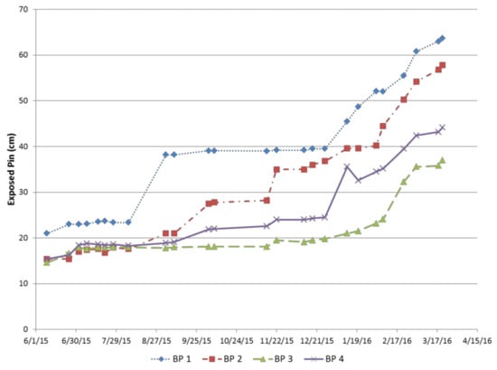 Bank pins have been used to compare erosion in varying land-use which represented urban, urbanizing, and agricultural watersheds as part of water quality assessment of sediment contributions to Chesapeake Bay. These studies used bank pins to measure cut-bank erosion and clay pads, or artificial horizons, installed to monitor floodplain deposition []. Measurements in these catchments showed that the net site sediment budget was best predicted by the ratio of the channel to floodplain width.