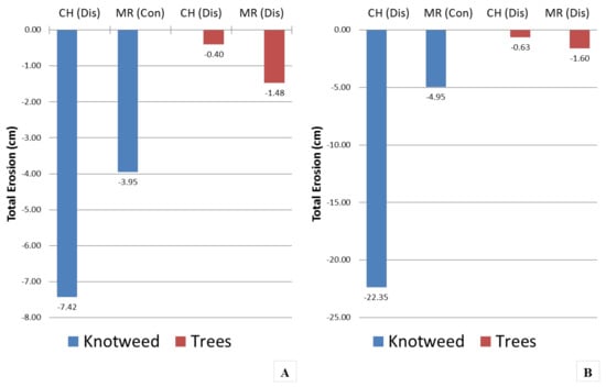 Total erosion at bank pin locations. The total erosion at each location from July to October 2015 (A) and October 2015 to March 2016 (B). The greatest amount of erosion occurred at the upstream highly disconnected reach containing mixed knotweed (CH BP Up) followed by a connected reach with knotweed (MR BP up). The least amount of erosion occurred at the downstream disconnected reach containing trees (CH BP Down) followed by a disconnected reach with trees (MR BP Down).