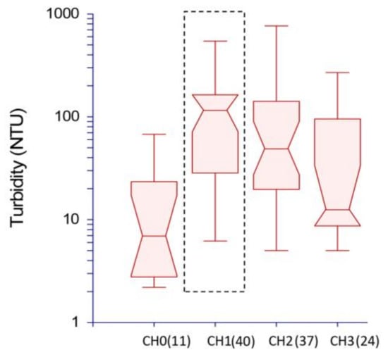 Comparison of box plots showed that the turbidity response increased between loggers CH 0 and CH 1, which represented the transition from the connected with trees to a disconnected reach with knotweed (Figure 7). The change in turbidity between these loggers was found to be statistically significant (p = 0.006) using Kruskal-Wallis One-Way ANOVA with a difference in mean turbidity of 81.7 NTUs. No significant difference (p = 0.665) was found between loggers CH 1 and CH 2 at the 95% confidence interval. CH 3 had a mean turbidity of 46.4 NTU lower than that of CH 2. However, because the turbidity at CH 3 had a high variability, this difference in mean turbidity was not statistically significant (p = 0.127) at the 95% confidence interval.