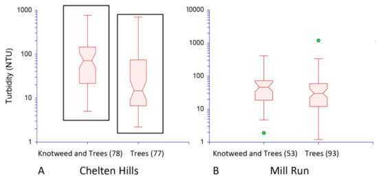 Turbidity response by vegetation. Outlined box plots indicate a statistical difference. When loggers were separated by vegetation type there was a statistical difference between mixed vegetation and trees only at Chelten Hills (A) but no statistical difference between the vegetation types at Mill Run (B). The logger site with trees at Chelten Hills was also highly incised.