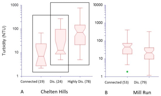 Turbidity response by degree of incision. Outlined box plots indicate a statistical difference. When loggers were separated by degree of incision there was a statistical difference between connected and highly disconnected reaches at Chelten Hills (A) and there was no statistical difference between the connected and disconnected reaches at Mill Run (B).