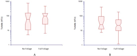 Turbidity Response to Change in Foliage: Turbidity data at loggers were analyzed to determine the influence of seasonality, based on the presence of foliage, at Chelten Hills (A) and Mill Run (B). While the mean turbidity does increase at both sites when no foliage was present, this change was not found to be significant at either site.