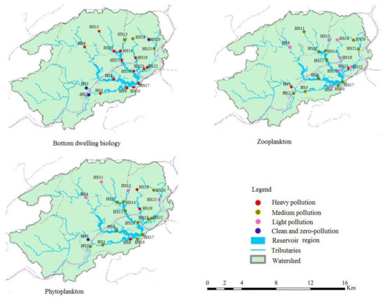 A total of 23 representative sampling points was set up in the Huangshi Reservoir area for the assessment of the water quality and hydrobiology (shown in Figure 1), from which two points were monitored in the Bamao River (HS1, HS2), two points were monitored in the Longtan River (HS4, HS5), two points were monitored in the Dongtan River (HS20, HS21), and only one point was monitored in both the Fanjiafang River (HS13) and the Liujiaxi River (HS18). The rest of the 15 points were monitored in the reservoir region. According to the monitored water quality data of the sampling points in the years of 2013–2015 for the surface water environmental quality standard of China (GB3838–2002), the water quality of the Huangshi Reservoir is in accordance with the requirements of drinking water quality. Namely, the water quality of Huangshi Reservoir is classified as degree II and III (shown in Table 2). However, the main water quality indexes, including the chemical oxygen demand (COD), the ammonia nitrogen (NH3-N), the total nitrogen (TN), and the total phosphorus (TP), exceed the environmental quality standards (shown in Table 3 and Table 4), with the Longtan River exceeding the standards most compared to with the other four tributaries.