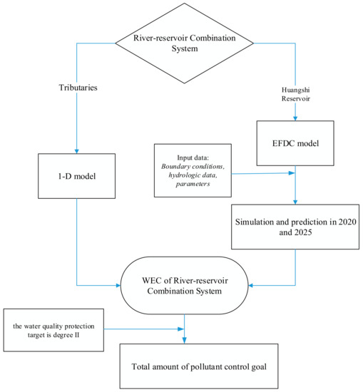 In order to simulate the WEC and control the amount of pollution of the Huangshi Reservoir with multiple tributaries in 2020 and 2025, we developed an integrated method to evaluate the WEC of the river–reservoir combination system, which consisted of the coupling of the 1-D model and the EFDC model. The technical route is as follows (Figure 3).