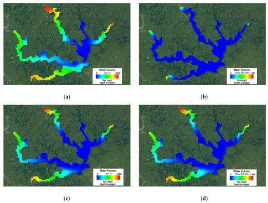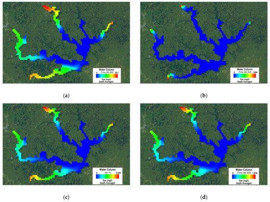 In this study, the EFDC model developed by Hamrick [37] was applied to the Huangshi Reservoir. This model is an integrated modeling system that has been successfully applied to many surface water systems, including rivers, estuaries, lakes, and coastal bays [12,38,39,40]. The EFDC model includes four major sub-models: (1) a hydrodynamic model; (2) a sediment transport model; (3) a toxic model; and (4) a water quality model. This simulation is mainly based on the EFDC hydrodynamic, convective diffusion, and first-order degradation modules of the water quality model.