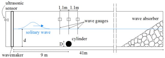 The occurrence of tsunami events in coastal areas is a source of risk for already-vulnerable marine structures subjected to the action of wind waves and currents. Hence, the stability of marine structures under tsunami action depends on the accurate assessment of the hydrodynamic forces. The reproduction of catastrophic tsunami waves like those that occurred in the Indian Ocean in 2004 and in Japan in 2011 was observed to be dependent upon the magnitude of the specific source, and the resulting shapes of surface elevation can be quite different, leading to a generalized modelling of tsunami waves (e.g., [,]). Owing to its robust and suitable approach, the modelling of the leading wave of a tsunami event is usually reproduced by the generation of solitary waves both experimentally and numerically (e.g., []). Indeed, when tsunami waves approach the coast, the wave trough disappears and only a positive peak remains.