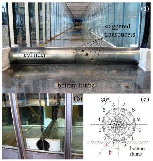 At about 9 m from the wave paddle, a circular cylinder with diameter D = 0.127 m was placed at the bottom flume ( = 0, where e is the distance between the bottom of the cylinder and the bed) with its longitudinal axis orthogonal to the wave direction (Figure 2a). This physical model was installed in the channel by means of a steel support equipped by a pulley system in order to accurately choose a specific location along the depth. To ensure unwanted displacements of the cylinder, C-shaped PVC supports were used at its edges (see Figure 2b). Moreover, a special glue was adopted to fix the cylinder at the bottom in order to inhibit the passage of water flows below it. Twelve pressure transducers (PDCR1830 model by Druck) were acquired in differential mode due to the Wheatstone-bridge configuration and mounted along the external surface of the cylinder at 30 intervals. Similar to the experimental tests with wind waves and currents performed by Aristodemo et al. [,], the transducers were slightly staggered along the longitudinal axis of the central part of the cylinder to avoid the use of a too-large diameter (see Figure 2a). The obtained dynamic pressures, , were determined by subtracting the static pressures from the records of total pressures measured by the transducers. The values of were assumed constant over the influence areas and evaluated as a function of the position of the transducers. Then, the horizontal () and vertical (,) hydrodynamic forces were deduced as: