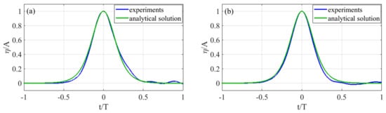 The evaluation of the solitary wave loads at the horizontal cylinder placed on the bottom channel depends on the suitable values of surface elevation at the cylinder section and the related free stream kinematic field at the cylinder, in addition to the correct generation of the solitary wave by the experimental piston paddle. Figure 3 highlights the comparison between the analytical solution given by Equation (1) and the experimental values of the surface elevation at the vertical axis of the cylinder for test number 5 (A = 0.037 m and T = 3.91 s, i.e., solitary wave with low amplitude and broad shape) and test number 30 (A = 0.071 m and T = 2.86 s, i.e., solitary wave with high amplitude and narrow shape), respectively. For both cases, a general good agreement on the incident solitary waves can be noticed, particularly for the higher values of . The reference time instant t = 0 refers to the passage of the solitary wave crest at the vertical section of the cylinder.
