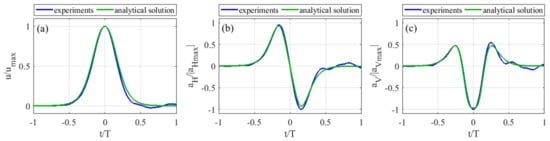 Time variation of undisturbed kinematic field at the transversal axis of the cylinder: comparison between analytical solution and experiments (test number 30). (a) Horizontal velocity, u; (b) Horizontal acceleration, ; (c) Vertical acceleration, .