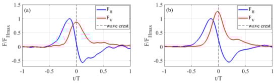 The undisturbed kinematic field, i.e., u, , and , in the Morison and transverse schemes was determined by Equation (3) from the experimental values of the surface elevation, , deduced from the wave gauge placed at the vertical section of the cylinder.