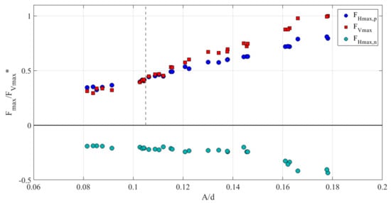 Taking into account all experimental tests, the positive and negative maximum horizontal forces ( and ) and the positive maximum vertical forces () as a function of are respectively shown in Figure 6. Note that these peaks are respectively normalized with respect to the positive maximum peak of the vertical force, *. As commonly carried out in the field of solitary waves interacting with offshore and coastal structures (e.g., []), the non-dimensional wave amplitude, , will be considered as simple representative parameter to evaluate the features of the hydrodynamic forces and coefficients compared to and since these parameters are dependent on the indirect knowledge of the undisturbed horizontal velocity at the transversal axis of the cylinder. Moreover, a more stable trend of the involved quantities when is adopted was observed. In general, the positive peaks increase almost linearly with , while the negative ones highlight a higher variation for > 0.15. The values of are lower than the positive ones and those referring to . It is interesting to note that, for < 0.105, values are slightly greater than , while values are greater than values for > 0.105 and, particularly, for high . The threshold corresponding to = 0.105 is highlighted in Figure 6 with a grey dashed vertical line. Considering the whole experimental range of , the values of and respectively exhibit an increase of 57% and 56%, with growth of about 69%.