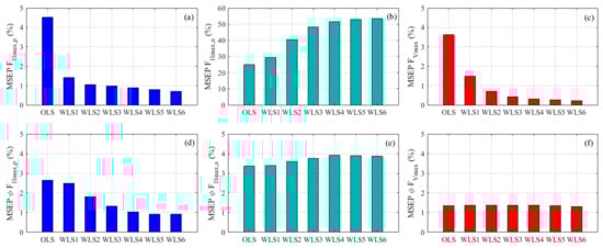 Experimental mean square error percent (MSEP) through OLS, WLS1, WLS2, WLS3, WLS4, WLS5, and WLS6 methods. (a) Maximum positive horizontal force, ; (b) Maximum negative horizontal force, ; (c) Maximum vertical force, ; (d) Phase shift, , associated with ; (e) Phase shift, , associated with ; (f) Phase shift, , associated with . OLS: ordinary least square; WLS: weighted least square.