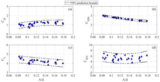 Figure 8 highlights the experimental values of , , , and in the Morison and transverse semi-empirical equations as a function of ranging from 0.08 to 0.18. The 95% prediction intervals are also plotted in Figure 8 and based on second-order polynomial fitting curves for , , and and on an exponential fitting equation for . Similar to the case with = 1 [], the hydrodynamic coefficients , and show a general decreasing trend when increases. This feature is particularly evident for the stable trend of horizontal inertia coefficient, while for the corresponding vertical one the trend is quite scattered, i.e., with the highest uncertainty, even if this kind of force component has a small weight in calculating the vertical load as compared to the lifting load, as successively highlighted in the application of semi-empirical force models. The values of generally tend to increase up to approximately = 0.15 with a corresponding = 1.4, followed by a tendential reduction. This particular feature can be heuristically explained through the formation of vortex patterns around the cylinder that allows the occurrence of drag and lift force components at the cylinder. Indeed, for low and , the increasing trend of is linked to a predominant transverse direction of the vortices compared to the incoming flow direction, while the decreasing trend of is related to a resulting movement of the vortices in the direction of the incident flow, as observed experimentally for regular waves by Sumer et al. [] and numerically for solitary waves by Aristodemo et al. []. Regarding the magnitude of the hydrodynamic coefficients, values range from 0.7 to 1.4, from 2.4 to 3, from 3.9 to 4.7, and from 3.7 to 6.9.