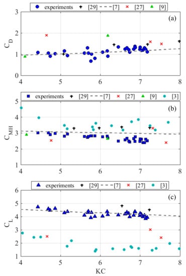 Experimental hydrodynamic coefficients vs. and comparison with literature coefficients for regular waves. (a) ; (b) ; (c) .