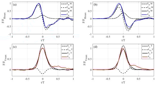 where is the lift coefficient and is the vertical inertia coefficient. The value of is the free stream vertical acceleration. It can be observed that, for = 0, the contribution of is usually considered negligible (e.g., [,]) even if this force contribution affects the magnitude and the shape of the total vertical force and it is here considered as in the case with = 1 []. Indeed, for > 0, the value of becomes relevant in modelling , as highlighted by Aristodemo et al. [].