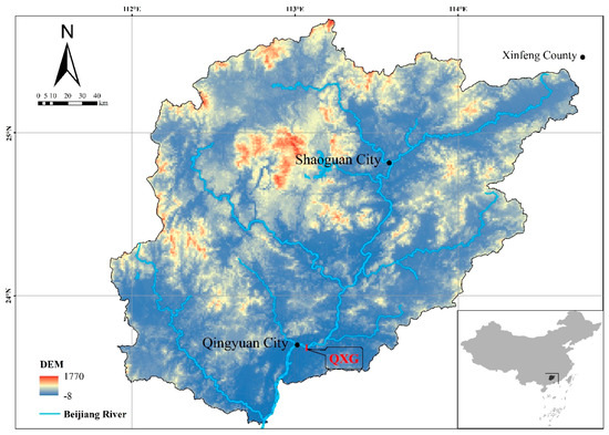The study focuses on the Beijiang River, which is the second largest tributary of the Pearl River [29]. The Beijiang River originates from Xinfeng County in Jiangxi province, and flows through Shaoguan City, Qingyuan City, and Foshan City of Guangdong province. The total length of the Beijiang River is 573 km, with a catchment area of 52,068 km2, accounting for 10.3% of the total area of the Pearl River basin.