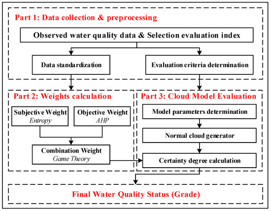 Therefore, the main objectives of this study are (1) to calculate a combination weight based on game theory integrating subjective weight and objective weight; (2) to construct an evaluation system of the cloud model; and (3) to analyze water quality grade in the study areas. This study aims to provide scientific and practical measures for water quality evaluation, prevention, and improvement of water quality assessment and other applications in the study areas.