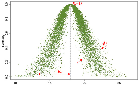 In this way, k intuitively controls the ‘atomization’ degree of the normal cloud model (Figure 3) and essentially reflects the variation of cognition of different evaluations. Here, k is assumed to be 0.1 to balance the variation and robustness of the assessment [33].