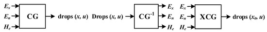 Cloud models are executed by cloud generators. Generally, two types of cloud generators exist: forward and the backward cloud generators. A forward cloud generator is the transformation between the qualitative knowledge and the quantitative representation and is used to generate the cloud drops through these given cloud numerical descriptors and it can be denoted with CG. Given these numerical descriptors of cloud and the specified x = x0, the combination to generator the cloud drops drop (x,) is called the X-condition cloud, which can be denoted by XCG. The backward generator is a transferring process to derive the qualitative concept, represented by three descriptors from cloud drops and it can be denoted by CG−1. The three cloud generators are shown in Figure 4. The combination of the two types of generators can be used interchangeably to derive various types of clouds to bridge the gap between qualitative concept and quantitative knowledge.