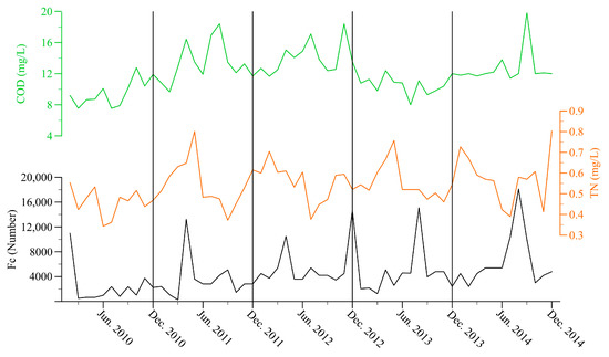 Generally, the different results mainly manifest since there were only one or two grade gaps between the results based on the three weights, suggesting that the index weight is not particularly sensitive to the cloud model. Even so, some differences still exist among the three groups of results. For example, in September 2014, the result of the CW was at grade IV, while the results of AHPW and EW were both at grade III. By analyzing the raw data of water quality monitoring, the measured values of COD and Fc were 19.8 mg/L and 9972 per liter, respectively, during this month (Figure 6), while the criteria of COD and Fc at grade III were ≤20 mg/L and ≤10,000 per liter. The measured value was very close to the threshold values; in this case, the evaluation results of EW and AHPW were all at grade III. However, combining Figure 5 and Table 4 and considering the raw dataset of other indexes, the fuzziness of the evaluation criteria, and the randomness of the monitoring results, we see that the water quality grade would be more reasonable if it were at grade IV. As another example, the water quality grade in March 2012 was at grade IV when using the EW. According to Figure 5 and the raw values, we found that grade II would be more reasonable. Accordingly, we can see that a combination weight based on game theory specializes in overcoming these problems of one-sidedness of single weight. At the same time, the measured content of COD, TN, and FC showed an increasing trend from Figure 6. It is possible that the annual increase in the number of inhabitants of Qingyuan has led to the increasing of domestic sewage emissions, resulting in the worsening of water pollution.