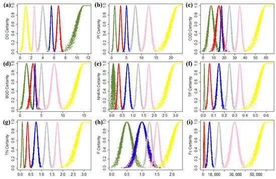 Forward clouds of different indexes at various water quality grades. (a) DO; (b) PI; (c) COD; (d) BOD; (e) NH4+-N; (f) TP; (g) TN; (h) F; and (i) Fc. The dark olive-green, red, blue, gray, pink, and yellow scatter cloud represent grades I, II, III, IV, V, and VI, respectively.