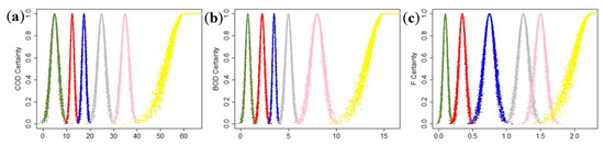 In this case, combined with standard water quality criteria (Table 1), the three perimeters (Ex, En, and He) of each evaluation index were calculated according to Equations (1) and (2). The modified equations are applicable for fixed intervals, noting that for grade VI of criterion PI, COD, BOD, NH4+-N, P, N, F, Fc, and for grade I of criterion DO, Bmax is missing. To attain the pseudo boundary, a hypothetical process indicates that Bmax is twice as large as Bmin. For example, for grade II of PI, Bmin = 2, and Bmax = 4 (see Table 1), the corresponding parameters can be obtained as Ex = 3 and En = 1/3. For grade VI of COD, Bmin = 40, and Bmax = 2 × Bmin = 80, the corresponding parameters can be obtained as Ex = 60 and En = 6.67. After attaining all quantitative boundaries of the grades of all criteria, all parameters are presented in Table 2. N was set to 2000 in this study to balance accuracy, robustness, and computational expense.