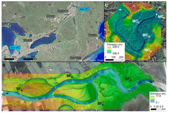 The first site is the downstream 8.6 km reach of the alluvial St. François River (SF hereafter), St. François-du-lac (Quebec, Canada), near its confluence with the St. Lawrence River (Figure 1b). A 3.4 km secondary branch forms an island within this reach. The primary branch has a sinuosity of 1.22. This channel has a bankfull (2-year return period) discharge of 1227 m3/s and a bankfull width of ~151 m when combining both branches. The longitudinal bed slope is around 0.04% in the main branch, and therefore markedly smaller than that of MC. The nature and lateral extent of riparian vegetation cover varied according to land use and to the occurrence of recent bank erosion episodes. A few banks were stabilized with riprap to protect roads near the island on both sides of the river. A narrow riparian zone—consisting of an assemblage of herbaceous plants, shrubs, and immature trees—is present next to agriculture lands. The trees were able to reach late succession stages in areas with less human impact near the deltaic area, near the downstream end of the island, and along the upstream left bank. A thorough analysis of the geotechnical properties of bank material revealed a sandy soil with several sandy silt, silty sand, and silt layers []; the silt material has a mean grain size of 0.075 mm. Mean grain size of the bed is 0.3 mm []. The average recorded retreat rates in the two bends downstream of the confluence were 1.53 and 1.13 m/year between September 2008 and 2010; these values are lower than the average of 3.53 and 2.07 m/year between 1964 and 2008 []. Channel bathymetry was surveyed from a boat using sonar and DGPS (differential global positional system) technologies []. A total of 22,934 topographic points were acquired along 91 cross-sections, with an average distance of ~140 m between two consecutive cross-sections. Bed elevation values were interpolated linearly in the downstream direction. Floodplain topography was defined based on 194,631 LiDAR points acquired in 2001 and combined to the bathymetry dataset to create a digital elevation model (DEM). The SF river banks were also surveyed in the spring and fall of 2009 and 2010 to identify the nature of bank retreat.