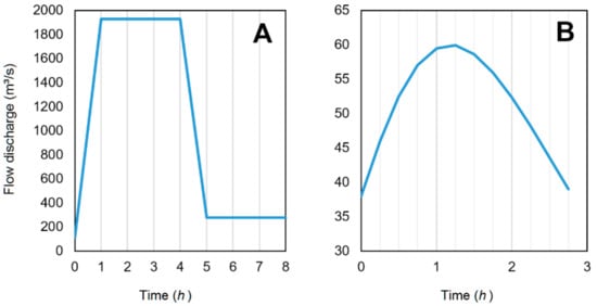 The largest flow discharge to be recorded at each site during the observation period was selected for subsequent numerical simulations. A verification was made to ensure that the selected flow discharges were indeed associated with bank retreat. Although flood hydrographs vary in magnitude, duration, and shape in nature, simple single-peak hydrological events were used in numerical simulations to limit the level of complexity, as morphodynamic modelling results are known to be affected by a large number of variables []. The duration of simulations was substantially reduced, relative to the duration of natural events being simulated, to limit simulation times.