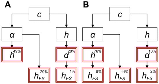 Simplification of tree classifications showing decision paths using fixed values of density (ρ) and friction angle (ϕ) based on field data for (A) SF sites, where ρ = 1950 kg/m3 and ϕ = 9.2° and (B) MC, where ρ = 2100 kg/m3 and ϕ = 40°. Each rectangle is associated with a decision along a path, e.g., c ≤ 2.5 kPa for the MC site. Each red rectangle is a terminal node along a decision path. Percentages indicate the occurrence of the path within the dataset. For instance, 76% of decision paths related to the MC site have the sequence c-α-h. Soil compaction was assumed to be equal to 0.75.