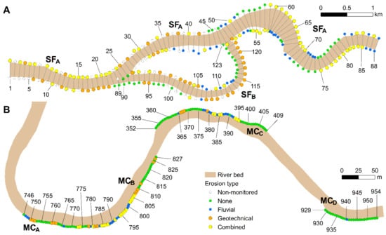 Observed bank erosion mechanism along river banks of (A) SF and (B) MC. Numbers refer to transect identifiers. For SF, sub-reaches A and B include transects 1‒88 and 89‒123, respectively. MC includes sub-reaches A (transects 746‒774), B (transects 775‒827), C (transects 352‒409), and D (transects 929‒954).