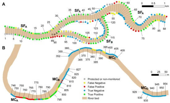 Transects placed at a regular interval, longitudinally along each reach (at each 100.0 m and 3.2 m, respectively, for sites SF and MC), were employed to classify bank locations in terms of stability; the categories employed were: stable, eroded by fluvial processes, eroded by geotechnical processes, and eroded by a combination of fluvial and geotechnical processes. For SF, the anthropogenically protected river banks that did not undergo any change were excluded from the analysis.
