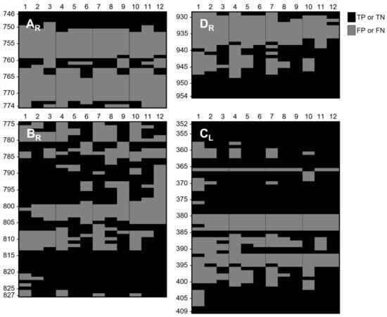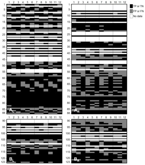 Agreement with observations for SF based on the components of the confusion matrix, i.e., FN = false negative, FP = false positive, TN = true negative, and TP = true positive. Rows indicate channel transects (see Figure 6), columns indicate parameter sets (see Table 5). White rows correspond to unmonitored transects. The subscript corresponds to the river side (L = left; R = right).