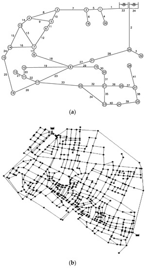 The application of this work concerned two case studies (Figure 2a,b, respectively). The first is the skeletonized WDN of Santa Maria di Licodia, a small town in Sicily, Italy [24,25]. The network layout is made up of 34 nodes (of which 32 are with unknown head and 2 source nodes are with fixed head, i.e., nodes 33 and 34) and of 41 pipes. The features of the WDN nodes and pipes are reported in the referenced work. At the generic demanding node, hmin and hdes were set at 0 and 20 m, respectively.