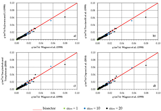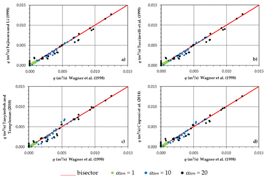 The graphs in Figure 4 and Figure 5 and Table 1 report results concerning analyses and comparisons in terms of outflow q to users. Those in Figure 4 compare the values of q obtained with the Wagner et al. [9] formulation with those obtained with the four other formulations. For αdem = 1, the values are very close because the pressure-driven dependence of q has not been triggered. For larger values of αdem, some differences arise. Far from the 0, the four other formulations yield close values to those of the Wagner et al. [9] formulation, with differences of a similar order of magnitude. However, the differences obtained through the Fujiwara and Li [12] and Tucciarelli et al. [13] formulations are always negative (underestimation). Those obtained through the Tanyimboh and Templeman [17] and of Ciaponi et al. [20] formulations, instead, are alternatively positive and negative. Close to the 0 of the Wagner et al. [9] formulation, all the other formulations tend to yield larger values of q. This behavior may be due to the softer declining trend that the other formulations have in Figure 1 when h/hdes goes down to 0.