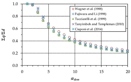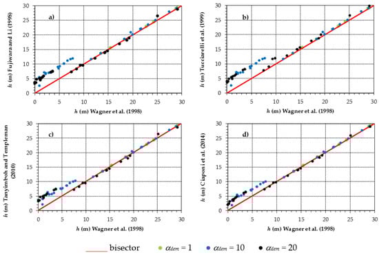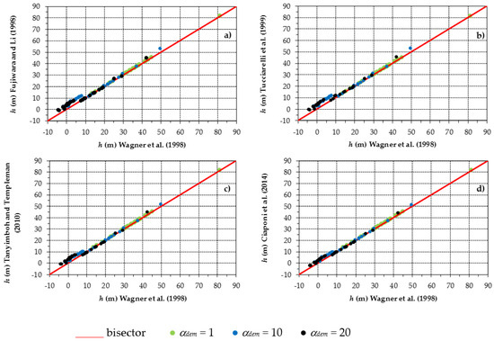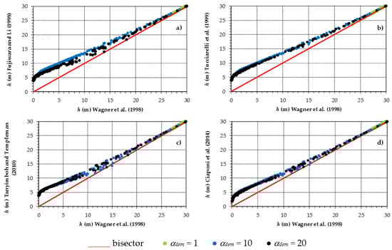 A quantitative estimation of the comparison shown in Figure 6 is reported in the following Table 2. This table points out that the mean absolute pressure head deviation of the various formulations compared to the Wagner et al. [9] formulation tends to grow with αdem. Overall, the Ciaponi et al. [20] and the Tucciarelli et al. [13] formulations are the closest and furthest, respectively.