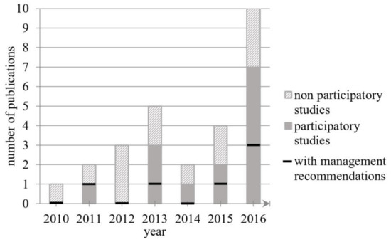 Yearly distribution of Web of Science articles assessing ES in mining regions (n = 26). 50% of selected articles used a participatory approach, and only 20% provided management recommendations. No articles fitting our scope were found for the 2000s decade.