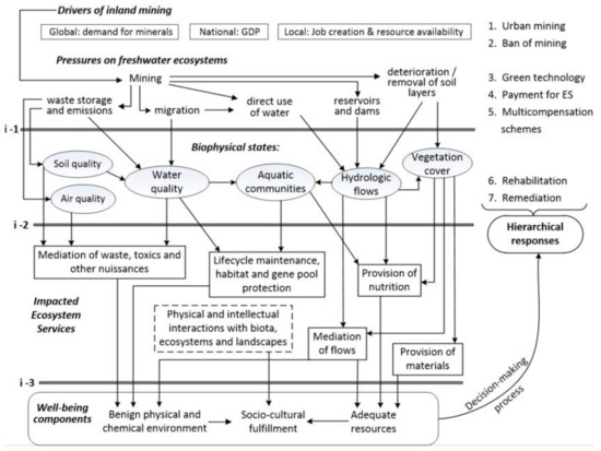 Regardless of spatial extent, geographical location or type of mineral extracted, assesment of mining impacts has been traditionally guided by quality standards (e.g., heavy metal concentrations) [121] from environmental legislation, presumably overlooking other types of impacts on SES. Weak environmental policies and enforcement for mining lead to detrimental effects on ecology [122]. By acknowledging the intrinsic value of biodiversity and natural structures in the maintenance of ecosystem functions, and the subsequent dependence of human well-being on the functioning of ecosystems, the ES concept is essential for developing policies that steer sustainable development of humans [123].