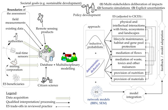 However, since no single ES modelling approach covers all needs and specifications [44], and given the growing interest to build holistic assessments, it is important to draw lessons from multiple efforts addressing ES case studies in mining regions and propose common ground for increasing policy relevance in future applications. We review ESA practice for inland mining contexts, scoping the consideration of ecological processes, water biophysical state indicators, stakeholder involvement and knowledge generation for policy development. To strengthen the validity of ESA, the scientific community recommends the use of accurate indicators for ES quantification [46,49], transparent communication of uncertainties [50,51], consideration of multiple demands, flows and interactions [52,53], and overall model robustness [44,54]. Thus, ES modelling approaches are analysed to reveal general trends in ESA for mining. Next, a systemic depiction of links and components serves us to generalize how freshwater ES are often assessed in mining contexts. Finally, a proposed framework revolves around how to build robust modelling approaches that support decision-making.