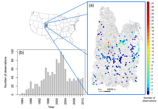 We construct a representative DOC value of each base-flow period for each sampling location and year. Because this value is constructed based on observations that are unequally spaced in time during the base-flow period, a simple average of these observations may be suboptimal because it can be biased due to redundant observations that are close in time. We tested three approaches for producing a single yearly value, but they result in negligible differences in constructed base-flow values, and the statistical analysis presented below (Section 3 and Section 4) produces practically the same results regardless of the averaging approach. Thus, we compute a monthly weighted average where the weight corresponds to the number of samples in each day; then the overall average is the weighted average of the monthly averages where the weight is the number of days with samples within each month. We then have 1174 observations representing base-flow DOC concentrations in 371 locations of the stream network. Figure 1a presents the spatial distribution of the 371 locations, and the color scale shows the number of observations at each location. The majority of locations have observations for 5 or fewer different years, while locations near urban areas (such as the front-range on the eastern limit of the stream network) tend to have more observations. Figure 1b displays the number of observations for each year during the 1983–2012 study period. Recent years tend to have more observations, and the period between 2000 and 2004 has the most observations.